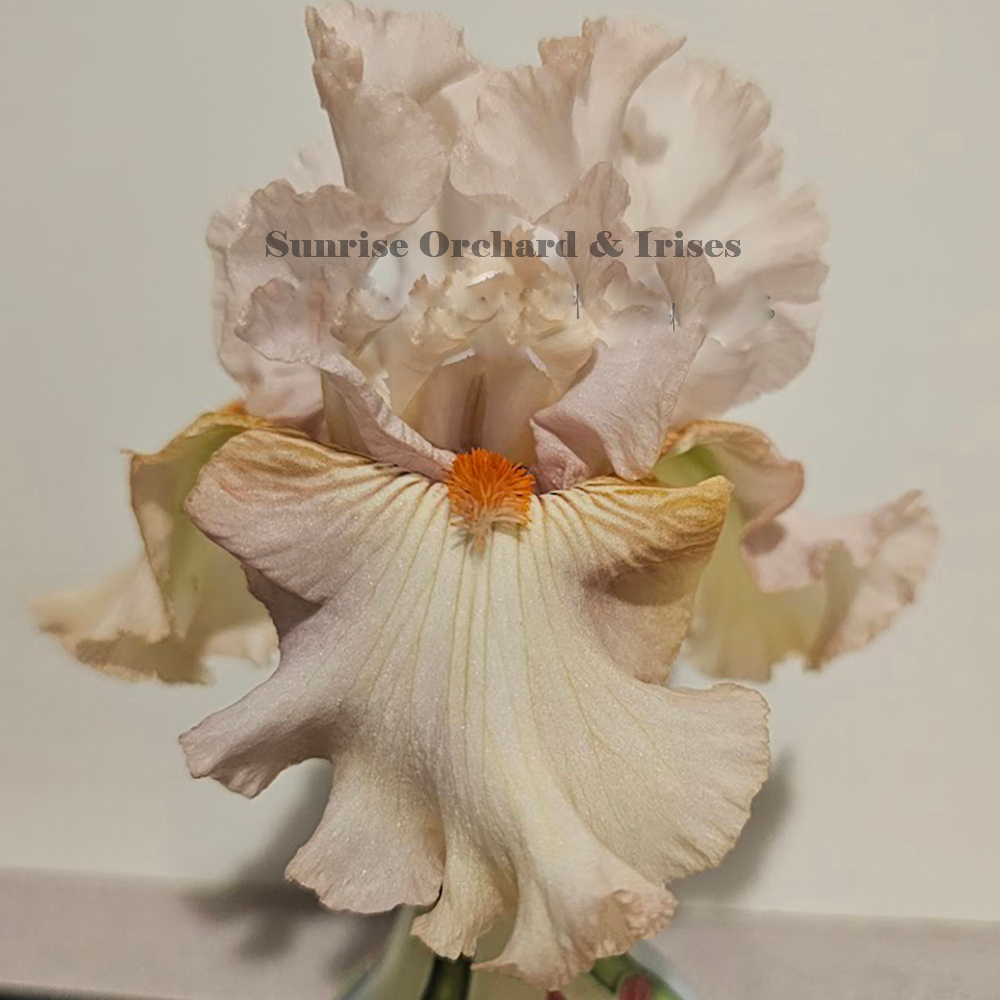 A stunning MTB (Miniature Tall Bearded Iris).  This is an off white self with a delicate wash of pink all over.  Light orange veining around haft.  Great bud count of 8, good branching.  Lovely fine straight stems with the appropriate sized flowers.